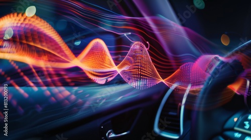 Vibrant sound waves emanating from car speakers, illustrating the immersive audio experience of a premium car audio system.