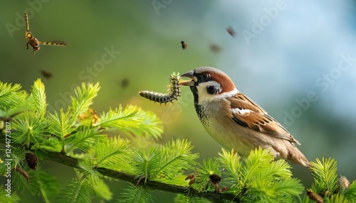 Vibrant Sparrow Nimbly Navigating Lush Greenery to Harvest Plentiful Caterpillars, Amidst a Canopy of Emerald Leaves and Fluttering Wings.