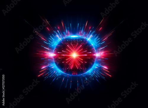 Vibrant sphere of light radiates intense blue and red energy on a dark backdrop. Bright beams emanate outward, creating a dynamic and futuristic abstract design.