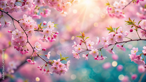 Vibrant spring background featuring delicate cherry tree branches with soft pink blossoms, blurred bokeh effect, and ample empty space for text or design.