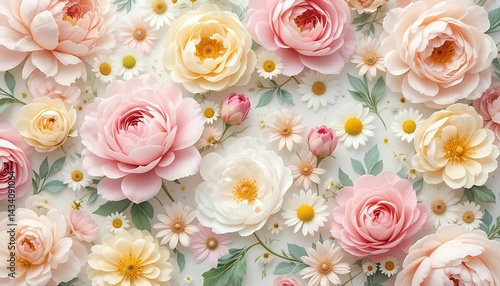 Vibrant Spring Floral Watercolor Background for Wedding Invitations & Social Media Soft watercolor floral background with roses, peonies, and daisies in pastel spring colors. Perfect for wedding