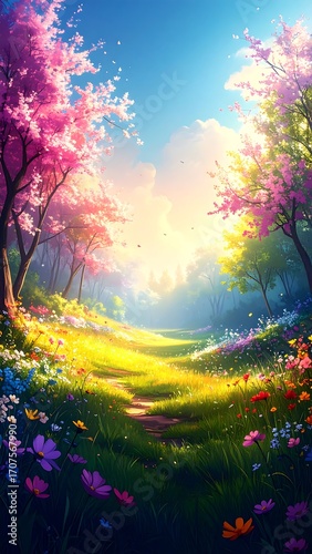 spring, forest, path, flower, tree, blossom, meadow, sunlight, colourful, lush, beautiful, nature, high-coloured, scenic, pathway, gentle, joyful, magical, tranquil, fantasy, pastel, dreamlike, artistic, digital, imaginative, honed, radiant, landscape
