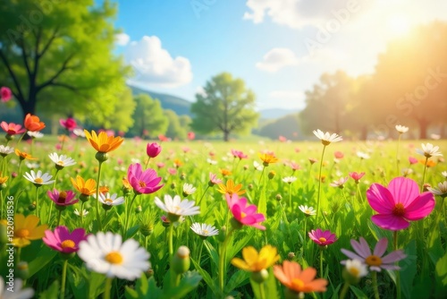 Vibrant spring meadow bursting with wildflowers in full bloom under a bright, sunny sky Perfect for nature, seasonal, and springtime themes , blossom, picturesque