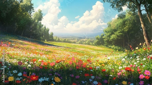 wildflower, meadow, spring, colourful, flower, nature, landscape, greenery, bright, sunny, bloom, sky, horizon, tranquil, scenic, fresh, beautiful, park, flora, natural, sunlight, vibrant, peaceful, grass, field, blue, tree, cloud, atmosphere, beauty, environment, picturesque, countryside, earth, blossom, cheerful, rural, season, growth, daylight, high-coloured, charme