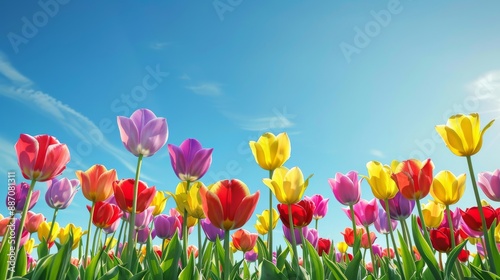 Vibrant Springtime Floral Field with Colorful Tulips under Bright Blue Sky Ideal for Posters and Prints