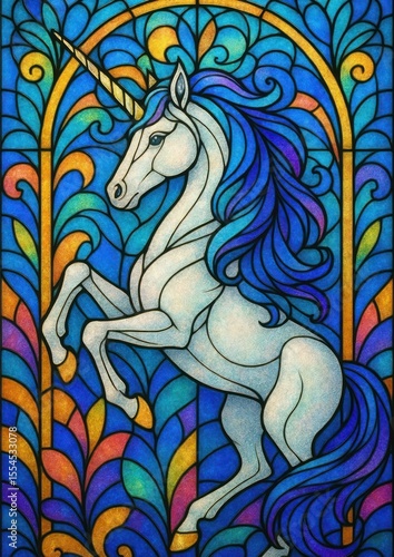 stained-glass, illustration, decorative, expression, artistic, colourful, creature, mythical, fantasy, pattern, stained, unicorn, vibrant, colours, design, person, tattoo, glasses, human, theme, skin, art