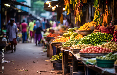 Vibrant street market with abundant fruits and busy shoppers