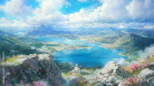 landscape, summer, mountain, lake, vibrant, cloud, nature, scenic, panoramic, sky, water, hill, horizon, greenery, flower, rock, vale, sunlight, outdoors, travel, adventure, exploration, peaceful, serene, picturesque, idylli, wilderness, environment, calmness, beauty, vista, terrain, rural, countryside, natural, bright, clear, fresh, open, expansive, breathtaking