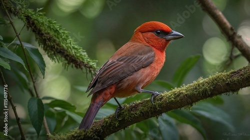 Vibrant Summer Tanager perched on a mossy branch. Stunning plumage and detail in natural habitat.