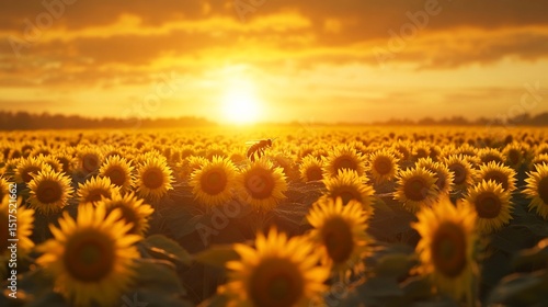 Vibrant sunflower field at sunset with a bee collecting nectar in the foreground