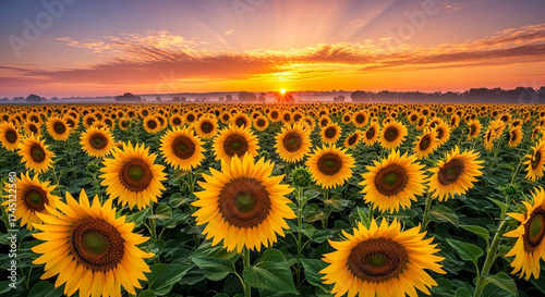 Vibrant sunflower field under a breathtaking sunset, showcasing the beauty of nature and the warm colors of the sky, creating a captivating and serene scene