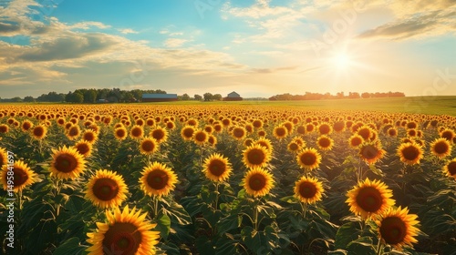 Vibrant Sunflower Field Under Blue Sky and Warm Sunset Glow