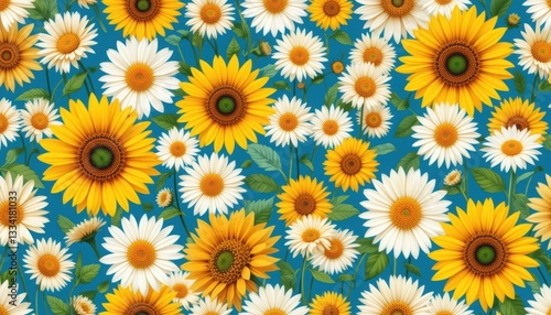 flower, sunflower, daisy, floral, nature, garden, bright, colourful, botany, plant, bloom, seasonal, beauty, vibrant, decoration, background, botanical, yellow, white, green, texture, pattern, summer, fresh, cheerful, sunlight, landscape, horticulture, organic, blissful, growth, environmentally friendly, blossoming, artistic, design, feminine, scenic, joyful, countryside, summer, environment, calmness, warm