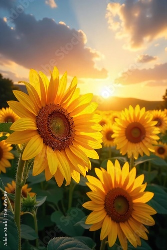 Vibrant sunflowers bask in the warm glow of a breathtaking sunrise, their faces turned towards the golden light A picturesque scene of nature's beauty at its finest , landscape, joy, nature
