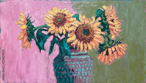 Vibrant Sunflowers in Vase, Impasto Style, Represents Beauty