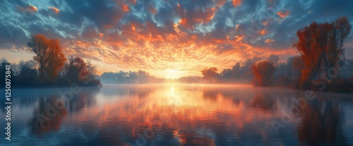 Vibrant sunrise over calm lake with autumn trees.