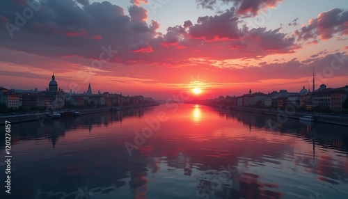 Vibrant Sunrise Over City River Reflecting Colorful Sky