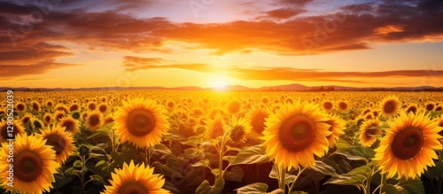 Vibrant sunset casting golden hues over a vast sunflower field, with bright yellow blooms in the foreground and a colorful sky in the background.