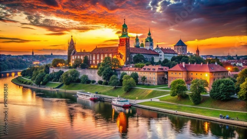 Vibrant sunset casts a warm glow on Krakow's historic cityscape, showcasing majestic Wawel Castle and Vistula River in picturesque Poland landscape.