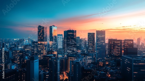 Vibrant sunset cityscape, skyscrapers illuminated at dusk.