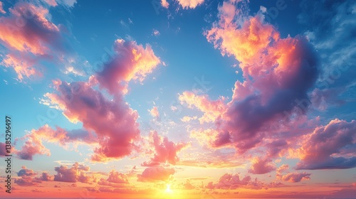 Vibrant sunset cloudscape over ocean; nature background for design