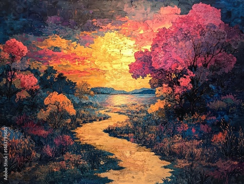 sunset, landscape, path, tree, water, painting, art, nature, scenic, vibrant, colours, colourful, twilight, evening, sky, hill, river, pathway, trail, texture, foliage, artistic, artwork, illustration, design, background, image, photo, picture, graphic, visual, media, element, asset, resource, material, content, digital, print, web, advertising