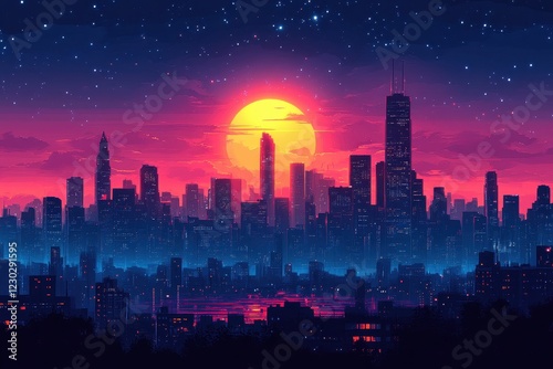 Vibrant sunset over a futuristic city skyline with glowing lights and starry sky