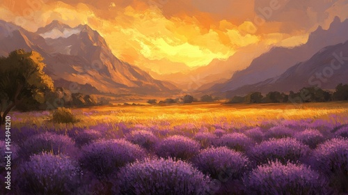 landscape, sunset, mountain, lavandula, field, purple, gold, yellow, orange, nature, scenic, view, summer, peaceful, serene, calm, tranquil, beautiful, vibrant, colours, gold, hours, evening, sky, cloud, hill, vale, meadow, flora, flower, rural, countryside, travel, photo, image, art, painting, digital, illustration, artwork, picturesque, idylli, romantic, amazing, breathtaking