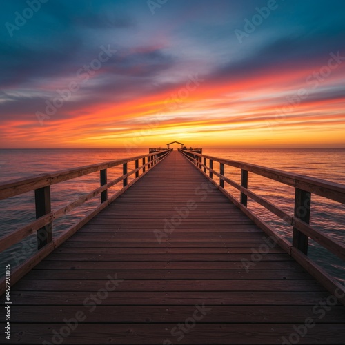 sunset, pier, ocean, sea, water, sky, horizon, beach, landscape, nature, colours, vibrant, twilight, evening, sunrise, wooden, dock, calm, serene, peaceful, tranquil, beautiful, scenic, view, travel, vacation, summer, holiday, gold, hours, orange, red, pink, purple, blue, cloud, wave, path, way, journey, destination, coast, shore, seaport, breakwater