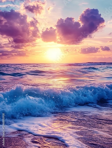 Vibrant Sunset Over Ocean Waves with Pink and Purple Clouds : Generative AI