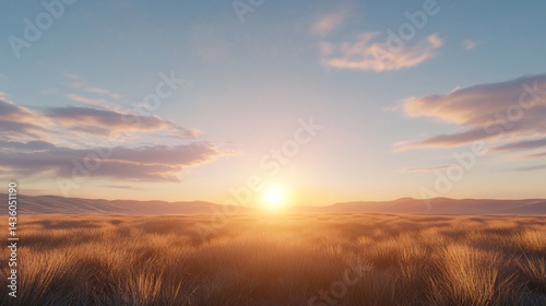 Vibrant sunset over rolling hills, warm hues illuminating a tranquil landscape, ideal for nature themes and serene backgrounds.