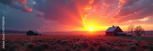 Vibrant sunset over rural farm country with barns, cold fields, and rainbow, sunlight, dramatic