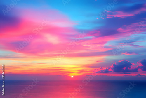 Vibrant sunset over the ocean, showcasing a breathtaking array of pink, purple, orange, and yellow hues painting the sky and sea.