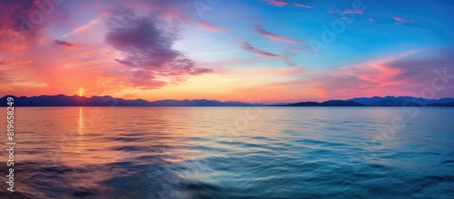Vibrant sunset over the sea with a beautiful array of colors reflecting off the rippling water creating a stunning vista with a copy space image