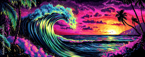 sunset, ocean, wave, beach, tropical, palm tree, sea, sky, cloud, horizon, nature, landscape, travel, vacation, paradise, relaxation, serenity, peaceful, beautiful, scenic, art, digital artwork, illustration, painting, colourful, high-coloured, bright, tropical paradise