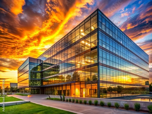 Vibrant sunset reflections dance across sleek modern office building facade, set against a warm evening sky, bathed in golden hues of dusk at corporate hub.
