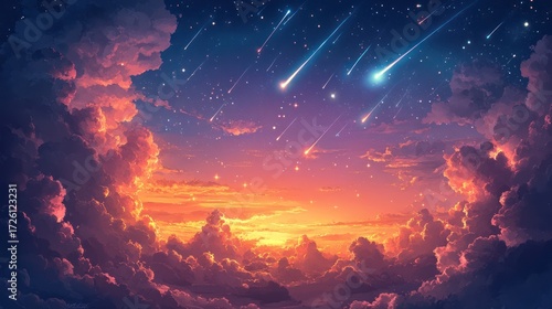 sunset, sky, cloud, meteor, shower, night, twilight, dusk, dawn, orange, pink, purple, blue, star, celestial, cosmic, space, astronomy, weather, atmospheric, dramatic, vibrant, colourful, fantasy, dreamlike, aethereal, magical, wonder, awe, beauty, nature, landscape, digital artwork, illustration, painting, artistic, creative, serene, peaceful, tranquil, gradient, horizon, cloudscape