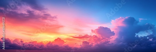 Vibrant sunset sky with soft clouds, horizon fading gently, a mesmerizing display of colors in a serene atmosphere