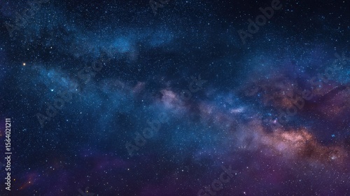 Vibrant swirls of blue, purple, and pink illuminate a clear night sky teeming with stars and cosmic clouds. This celestial view evokes a sense of wonder and exploration