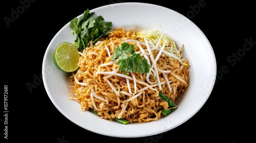 Vibrant Thai Fried Noodles with Lime and Herbs on Stylish Plate Viewed from Above, Exuding Freshness and Flavor