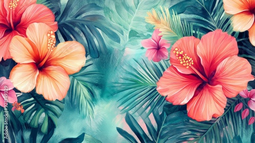 Vibrant tropical floral background featuring lush greenery and colorful hibiscus flowers in full bloom.