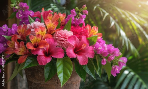 flower, tropical, bouquet, hibiscus, bougainvillea, vibrant, pink, orange, purple, bloom, blossom, nature, plant, flora, garden, summer, spring, fresh, colourful, bright, exotic, arrangement, pot, green, leaf, sunlight, warm, beauty, natural, decoration, celebration, gift, romance, wedding, event, vibrant color, floral, flora, closeup, detail, lush, rustic, sunbeam