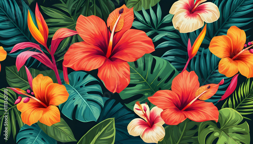 Vibrant tropical flowers in botanical illustration style with lush hibiscus against deep green background