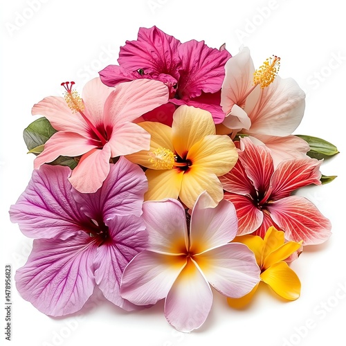 hibiscus, plumeria, flower, bouquet, tropical, vibrant, colourful, arrangement, floral, beauty, nature, exotic, closeup, flower petals, blossom, bloom, bright, colours, summer, delicate, fragrant, paradise, relaxation, serenity, joy, happiness, peace, calmness, wellness, spa, luxury, romance, passion, love, feminine, elegance, softness, freshness, intricate, detailed, artistic, visual, image, photo, still life, botanical