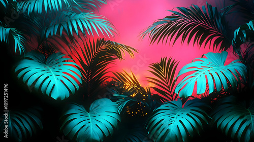 greenery, flora, artwork, digital, fantasy, surreal, retro, texture, design, lush, wallpaper, tropical paradise, dreamy, jungle, 80s, illustration, bright, graphic, neon, teal, botanical, graphic design, foliage, art, summer, leaf, bold, tropical, palm, vibrant, background, vintage, colours, aesthetic, plant, monstera, nature, paradise