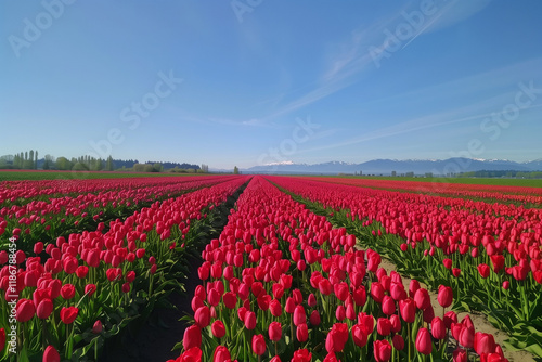 Vibrant tulip field basking in spring sunshine.
