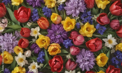 Vibrant tulips, daffodils, and hyacinths in a spring bouquet on textured paper , springtime, botanical