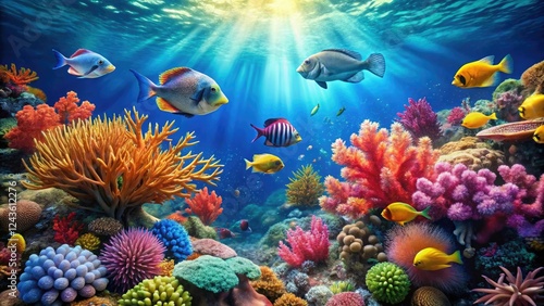 Vibrant turquoise-colored coral reef teeming with marine life including colorful fish and seaweed swaying gently in the current, biodiversity, marine life