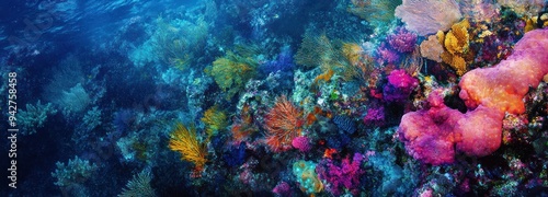 coral, reef, ocean, underwater, blue, green, yellow, orange, red, pink, purple, vibrant, colourful, life, marin, nature, sea, aquatic, ecosystem, fluorescence, glow, beauty, delicate, intricate, texture, pattern, tropical, exotic, diversity, fragile, preservation, conservation, environment, water, surface, light, shadow, depth, perspective, landscape, scene, background, abstract