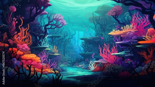 Vibrant underwater coral reef scene with colorful coral and marine life. Ocean, sea, and underwater background for marine conservation, nature, and aquarium themes.